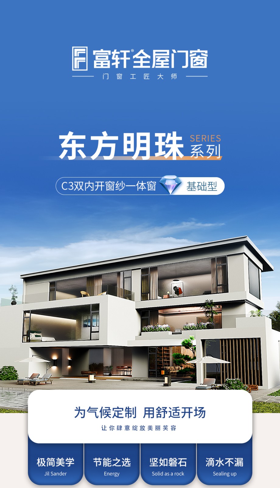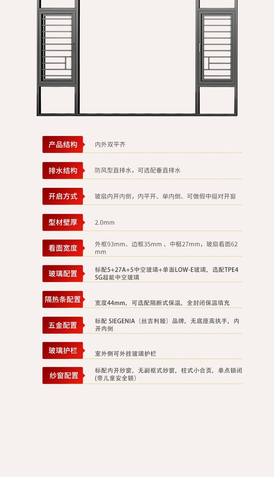 系列:東方明珠 型號:C3 水密性能:6級 氣密性能:8級 抗風壓性能:9級 隔音性能:≥40DB 保溫性能:K≤1.2 隔熱條:國產(chǎn)隔熱條 膠條工藝:焊接鴨嘴膠條 壁厚:2.0mm 中空:5+27A+5 壓線:方形壓線 開啟方式:內(nèi)開、內(nèi)開內(nèi)倒 防護欄/選配:玻璃護欄 護角:圓弧護角(不銹鋼) 紗網(wǎng):選配外掛紗窗 標配鎖具:絲吉利婭無底座高執(zhí)手,單點鎖閉(帶兒童安全鎖)