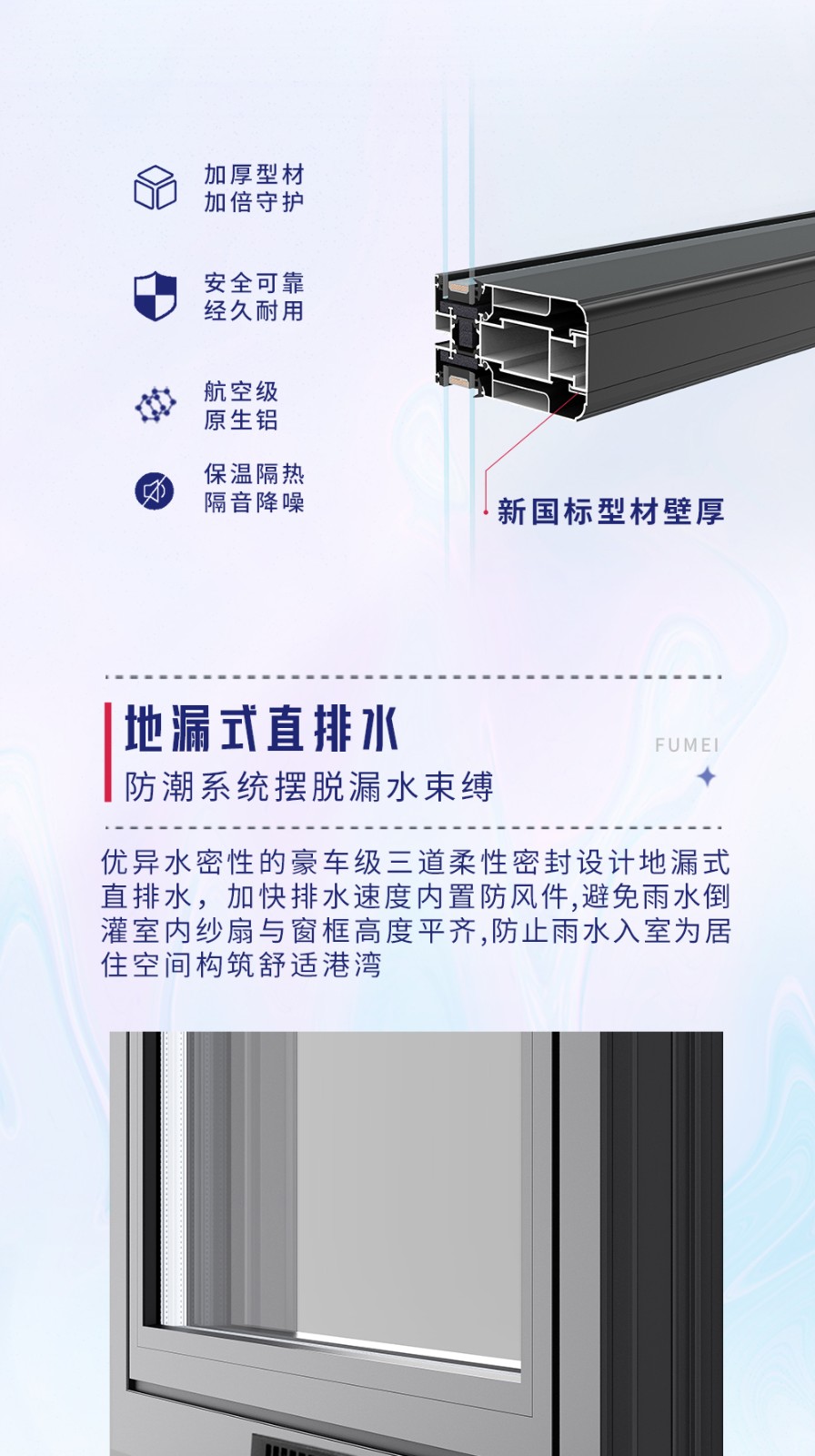 系列:富美 型號:S35 水密性能:6級 氣密性能:8級 抗風壓性能:9級 隔音性能:≥35DB 保溫性能:K≤2.3 隔熱條:國產隔熱條 膠條工藝:拼接工藝 壁厚:1.8mm 中空:5+20A+5 壓線:圓弧壓線/選配 斜邊壓線 開啟方式:外開、外開外懸、下懸窗 防護欄/選配:固定、可開啟 護角:圓弧護角(不銹鋼) 紗網:金剛網/選配不銹鋼高清網 標配鎖具:維哈根無底座歪執手