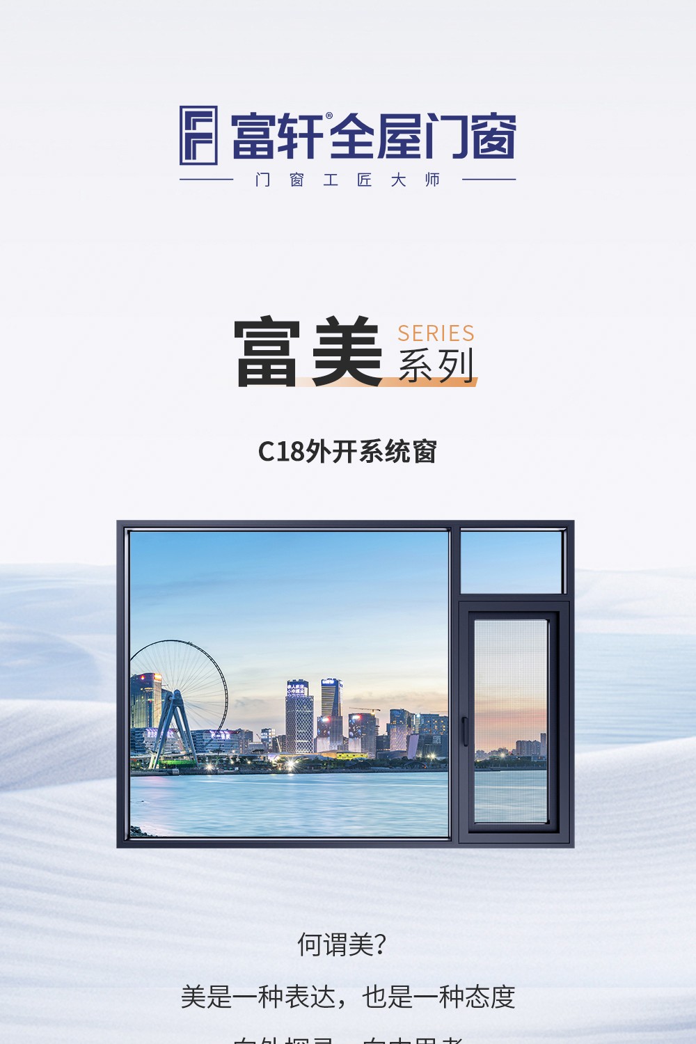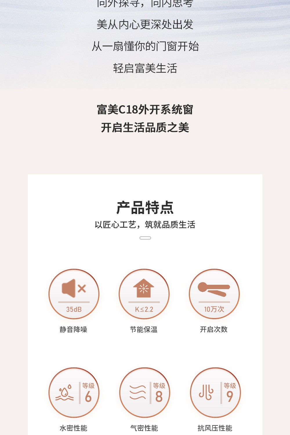 系列:富美C18 型號(hào):C18/原F8 水密性能:6級(jí) 氣密性能:8級(jí) 抗風(fēng)壓性能:9級(jí) 隔音性能:≥35DB 保溫性能:K≤2.2 隔熱條:國產(chǎn)隔熱條 膠條工藝:拼接工藝 壁厚:1.8mm 中空:5+15A+5 壓線:圓弧壓線 開啟方式:外開、外開外懸、下懸窗 防護(hù)欄/選配:固定 護(hù)角:圓弧護(hù)角(不銹鋼) 紗網(wǎng):選配 標(biāo)配鎖具:維哈根無底座歪執(zhí)手