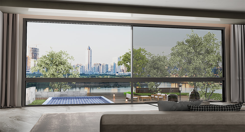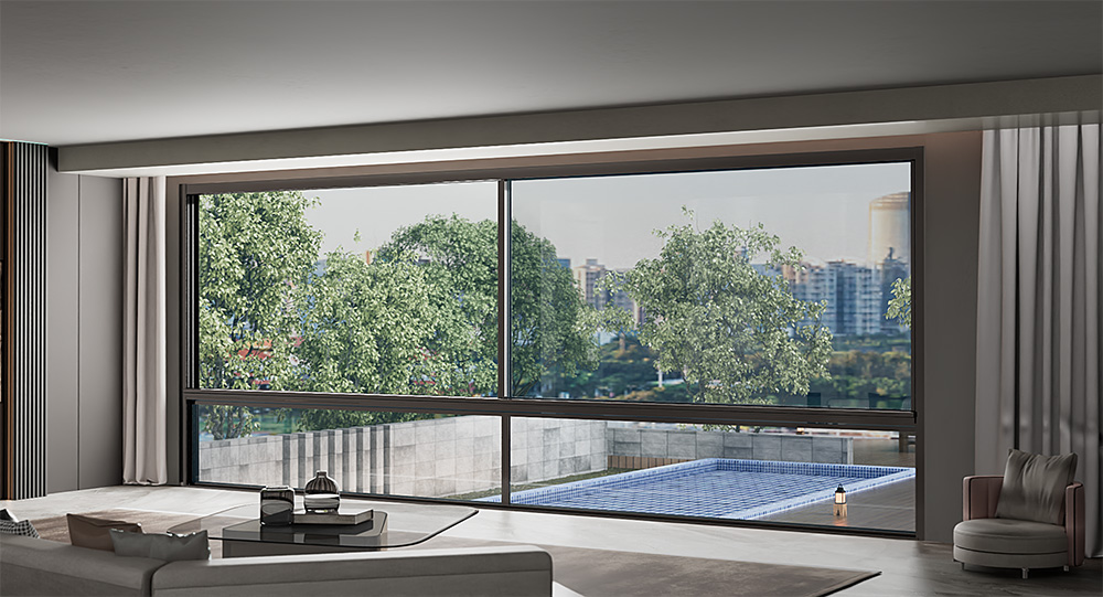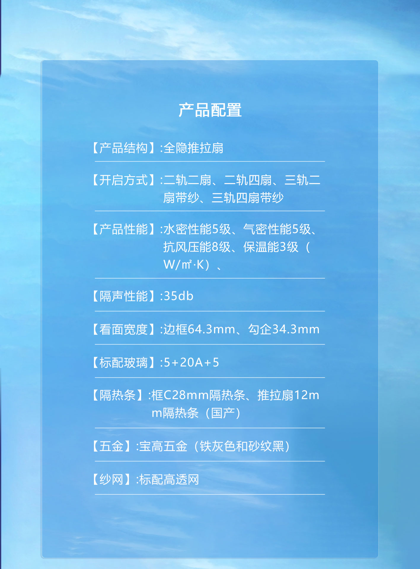 【產(chǎn)品系列】:全隱極景推拉窗 【開啟方式】:二軌四扇、二軌二扇、三軌二扇帶紗、三軌四扇帶紗 【產(chǎn)品性能】:水密性能5級、隔音性能≥35DB、氣密性能5級、抗風(fēng)壓性能8級、保溫性能K≤3 【產(chǎn)品結(jié)構(gòu)】:全隱推拉扇 【看面寬度】:邊框64.3mm、勾企34.3mm 【五金配件】:寶高五金(鐵灰色和砂紋黑) 【標配玻璃】:5+20A+5