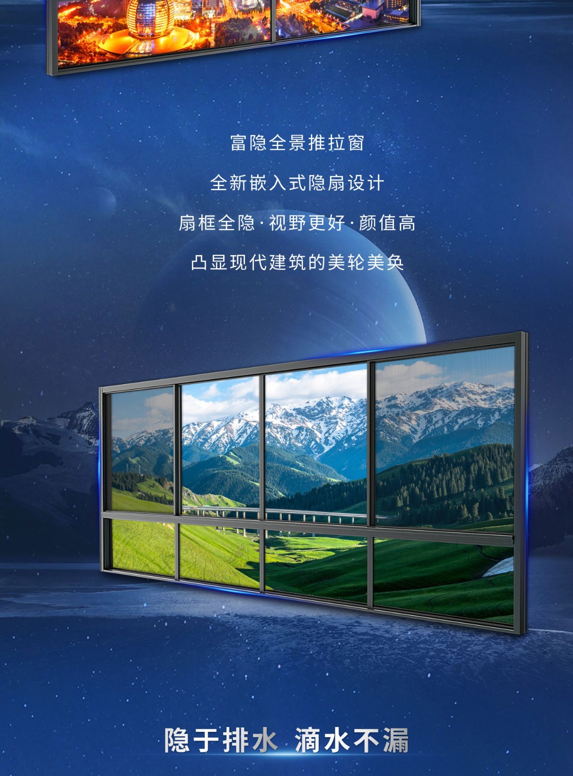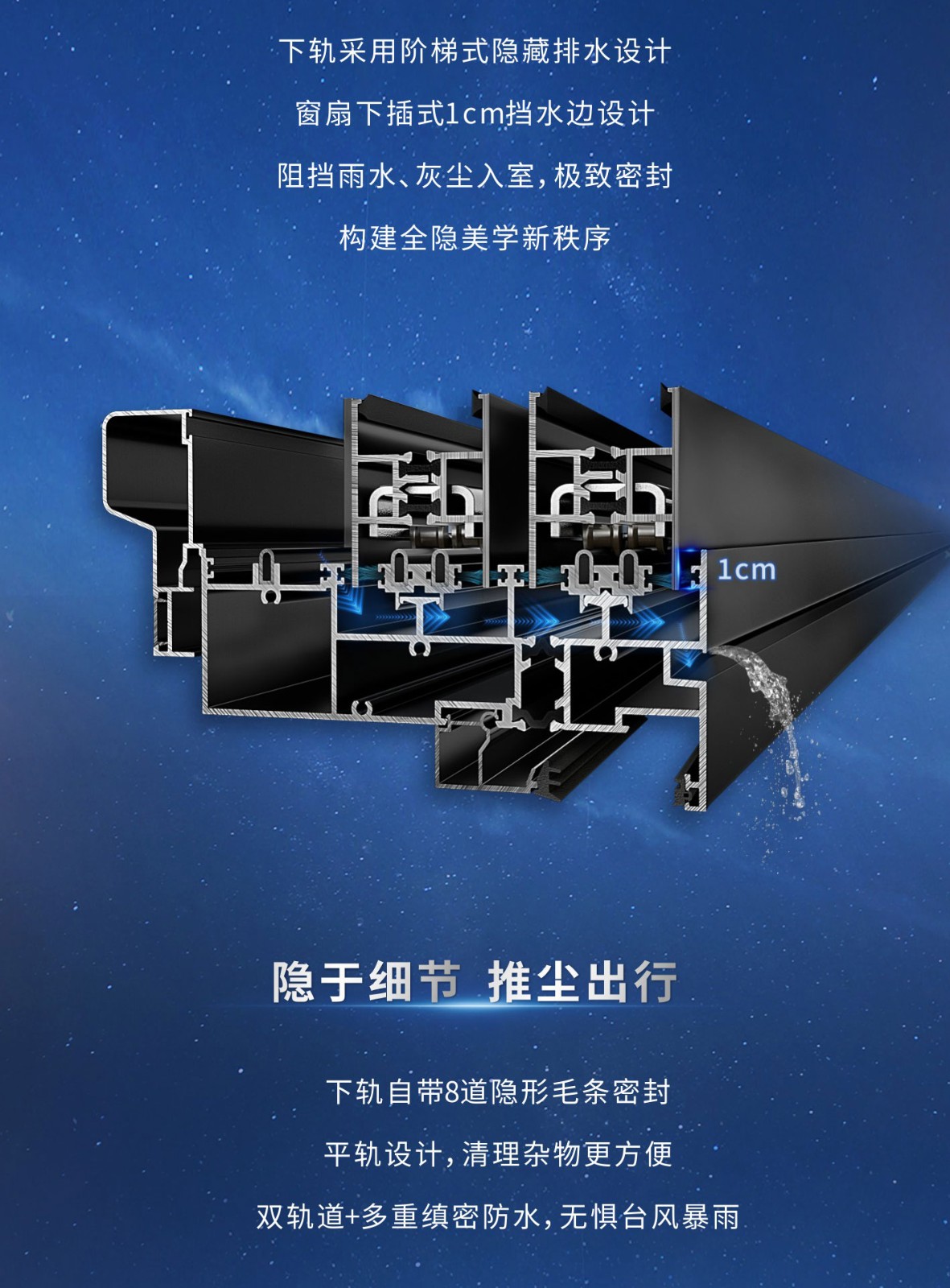 雙軌道設(shè)計,自動雙勾碰鎖,推拉扇全隱,防水設(shè)計,軌道全平設(shè)計,下軌排水隱藏設(shè)計,毛條密封。