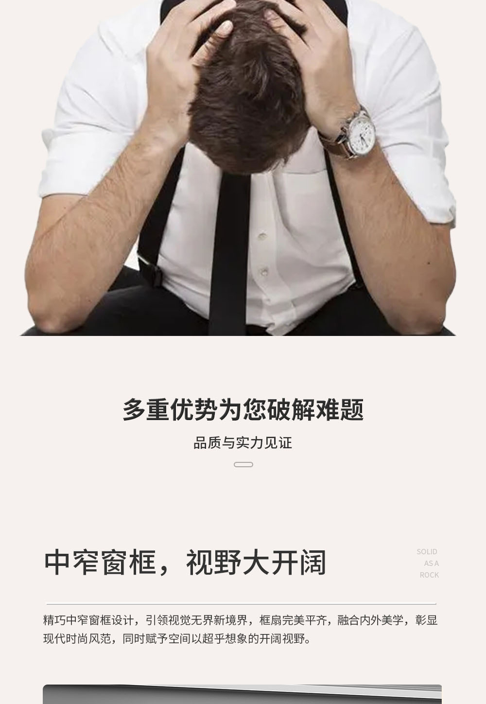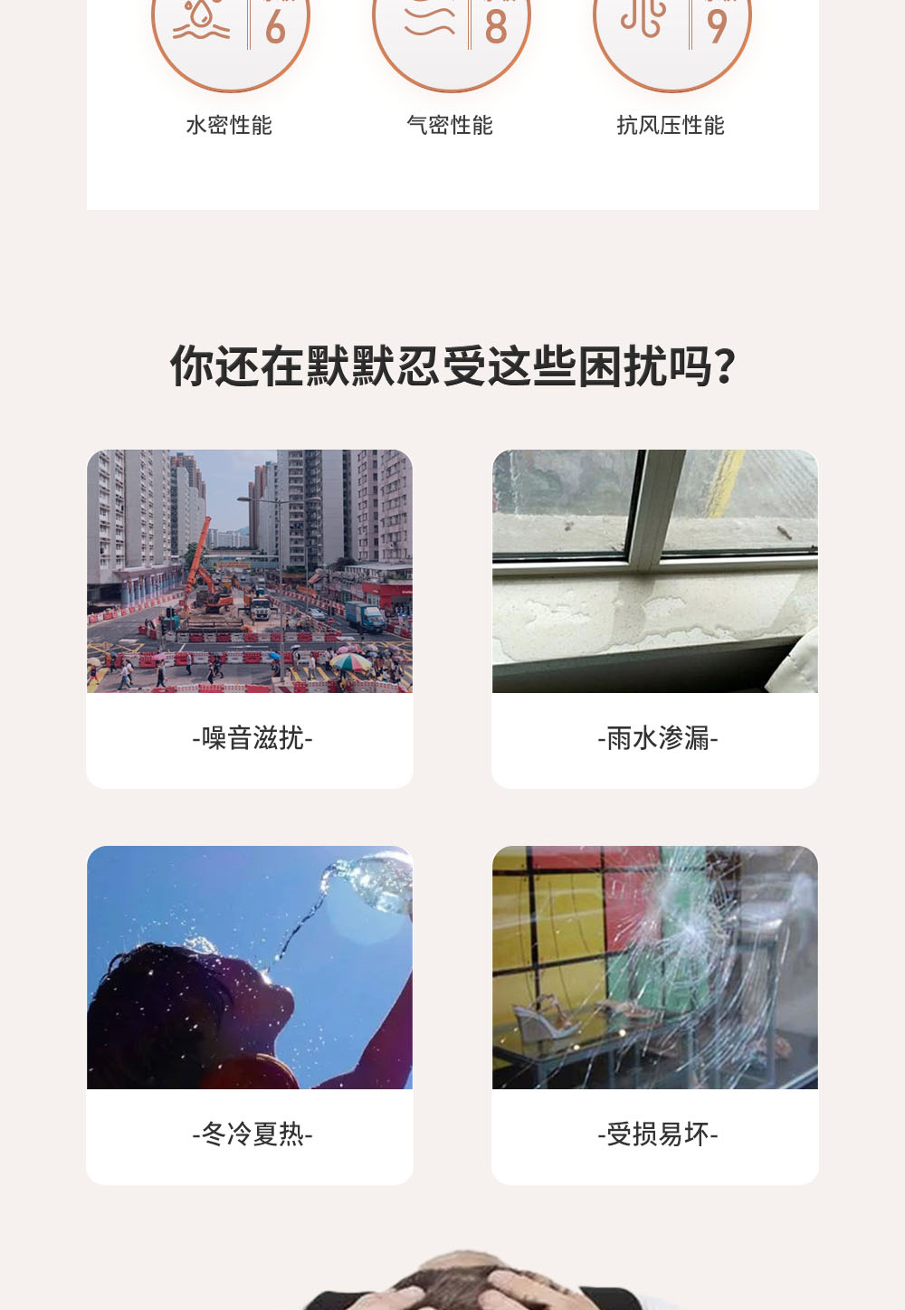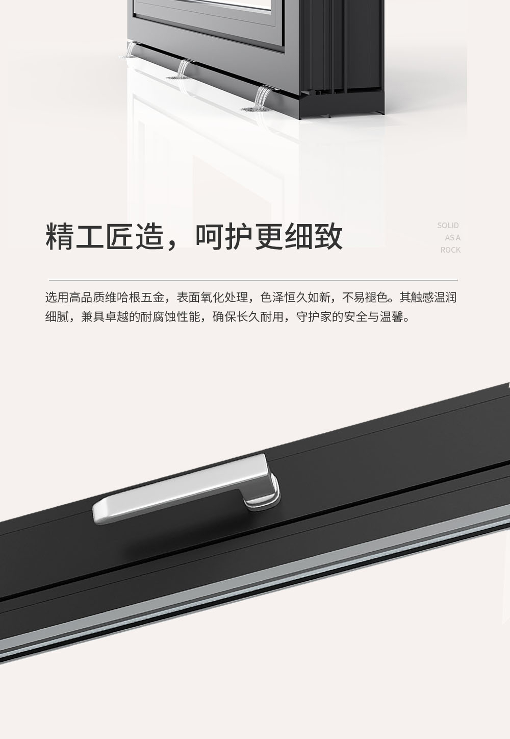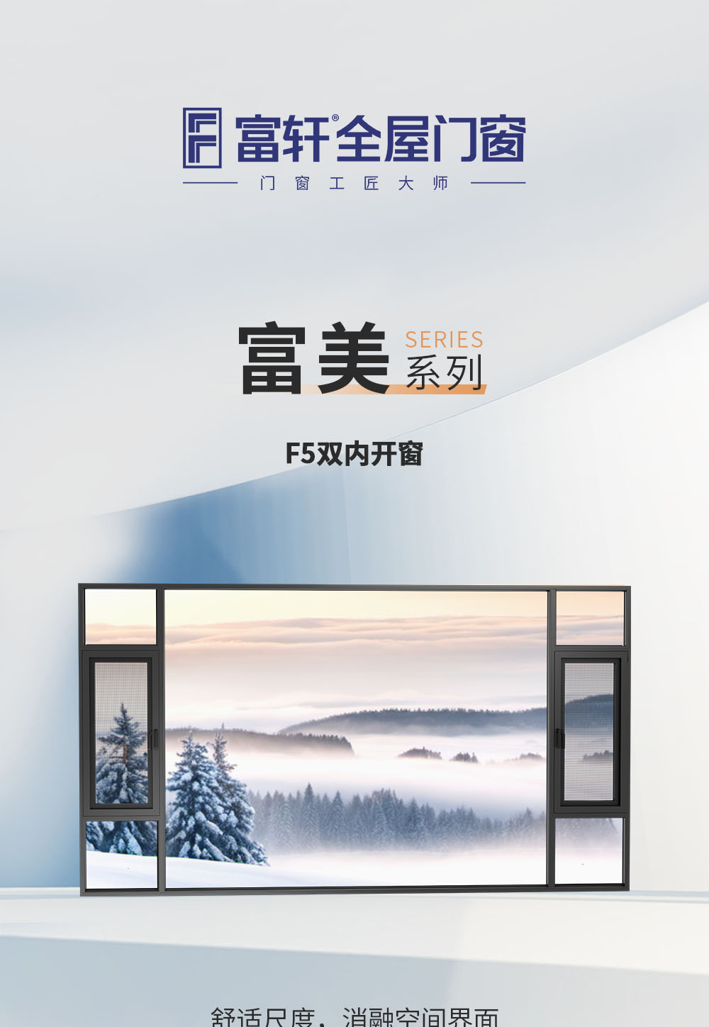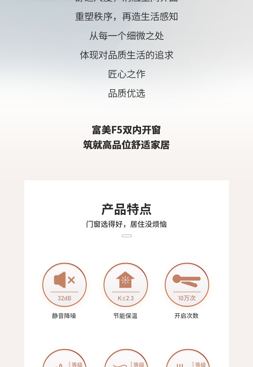系列:富美 型號:F5 水密性能:6級 氣密性能:8級 抗風壓性能:9級 隔音性能:≥32DB 保溫性能:K≤2.3 隔熱條:國產隔熱條 膠條工藝:標配:拼接工藝,可選配焊接工藝 壁厚:2.0mm 中空:5+15A+5 壓線:方形壓線 開啟方式:內開、內開內倒 防護欄/選配:玻璃護欄 護角:圓弧護角(不銹鋼) 紗網:選配 標配鎖具:維哈根無底座高執(zhí)手