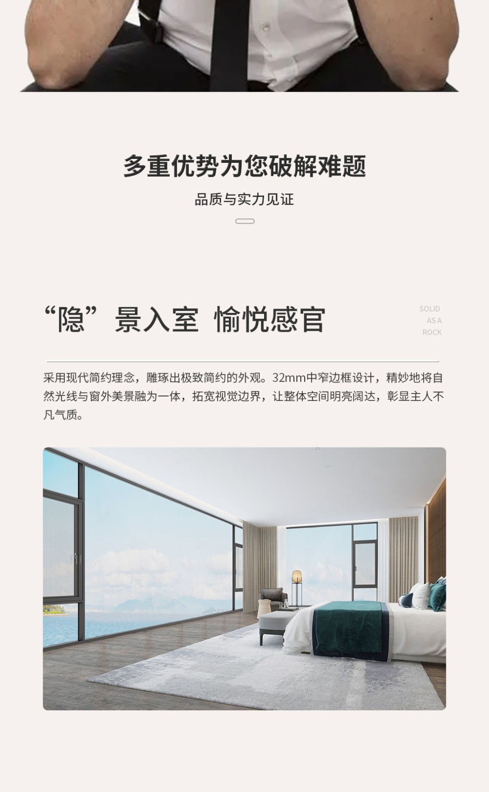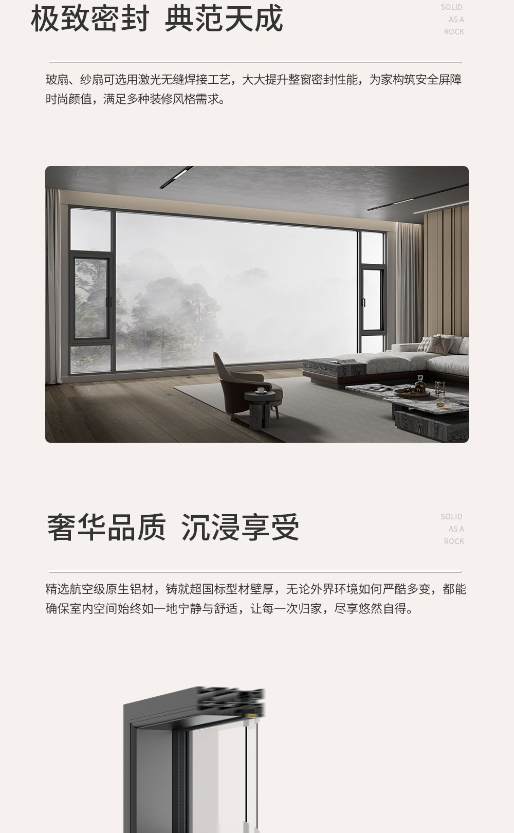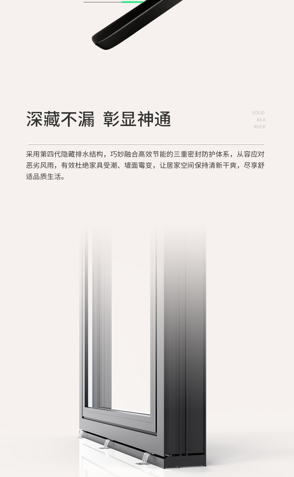 系列:富隱 型號:S25 水密性能:6級 氣密性能:8級 抗風壓性能:9級 隔音性能:≥33DB 保溫性能:K≤2.5 隔熱條:國產隔熱條 壁厚:1.8-3.0mm 中空:固定可選配 壓線:可選配/圓弧壓線/斜邊壓線 開啟方式:外開、下懸窗 防護欄/選配:固定 護角:圓弧護角(不銹鋼) 紗網:選配 標配鎖具:玻扇側面直柄式執手,紗扇平面式按壓鎖,附帶兒童安全鎖