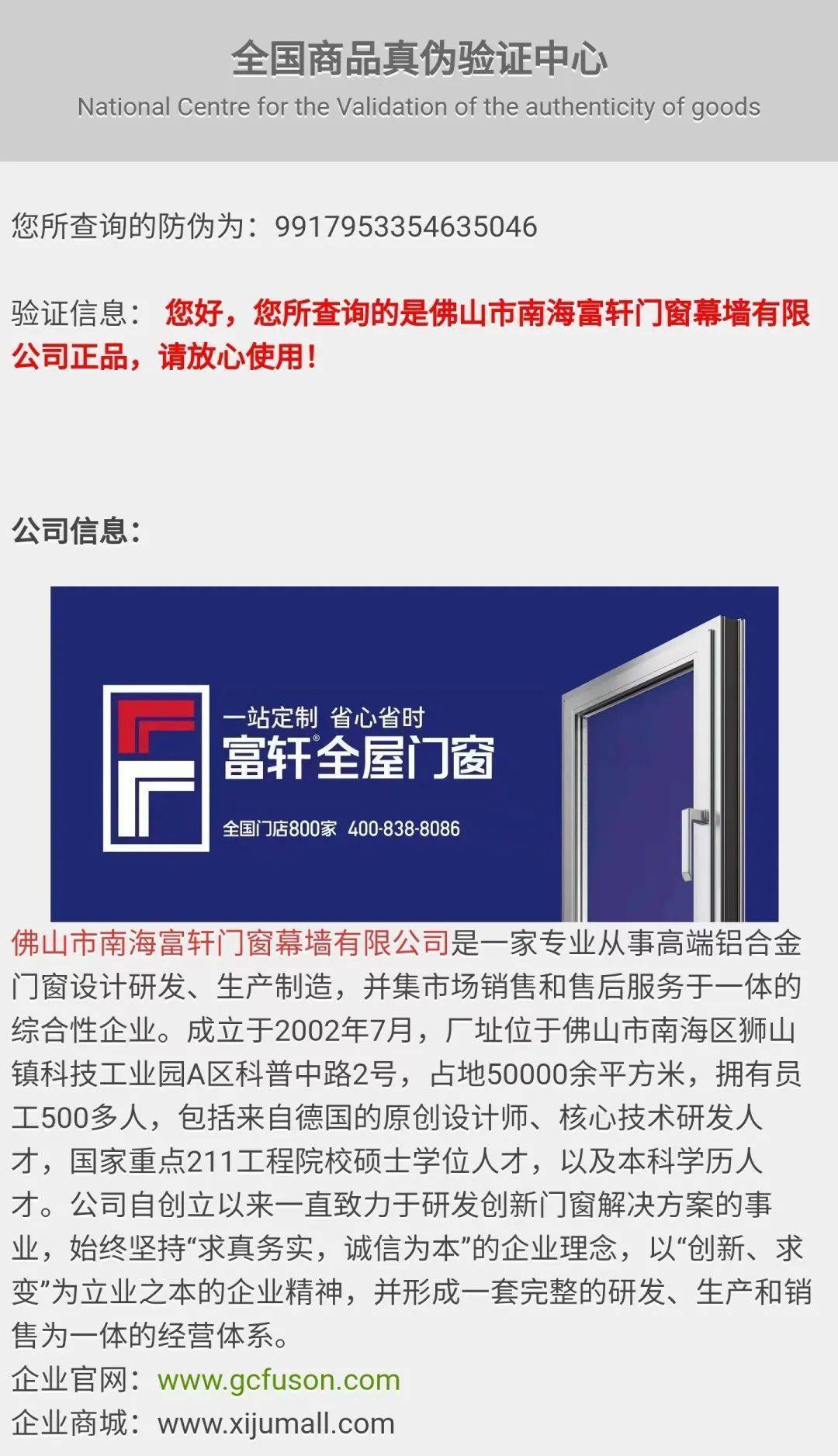 系統自動進入“全國商品真偽驗證中心”,掃碼后,出現以下正品頁面,說明您所購買的富軒全屋門窗產品為正品,請放心使用。