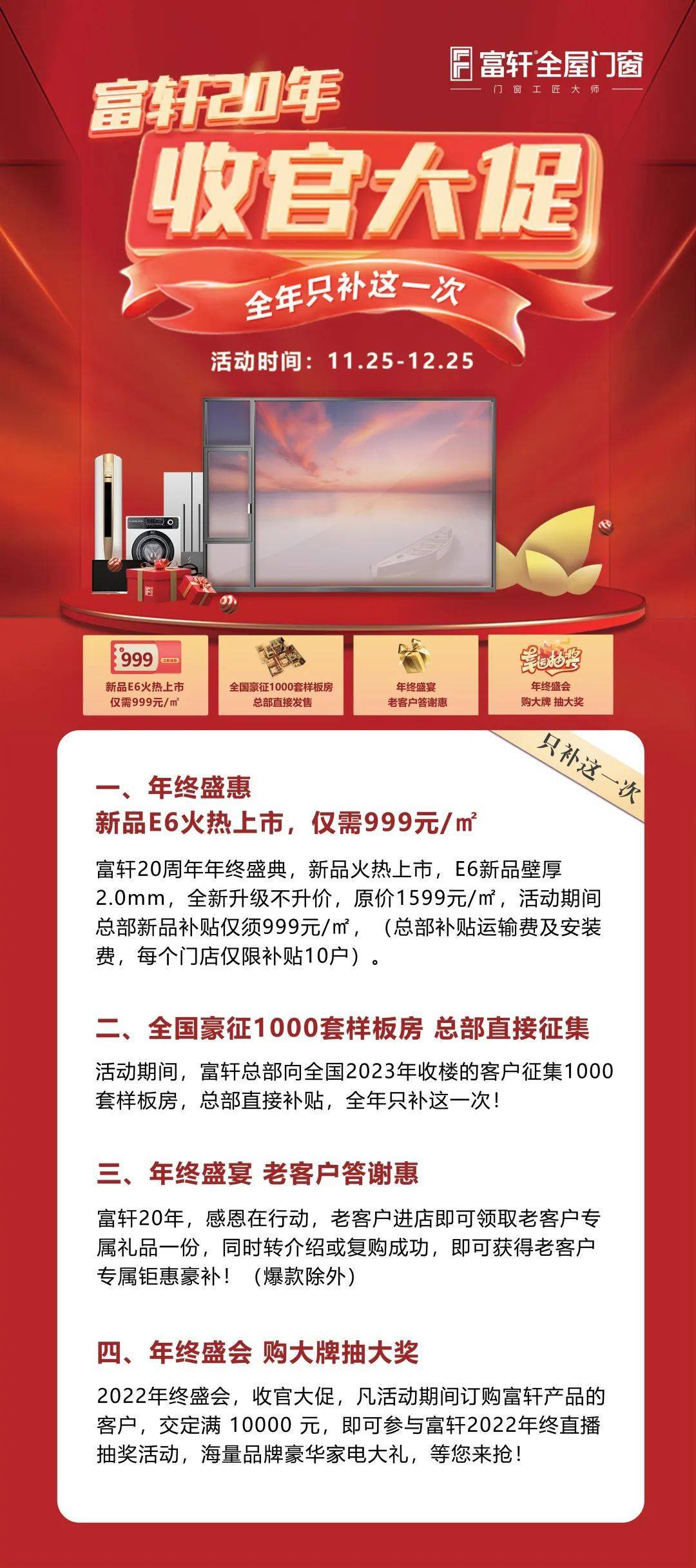 不繞彎,沒套路。狂熱的“雙十二”,看得見摸得著的優(yōu)惠才是王。2022年11月25日-12月25日,富軒全屋門窗重磅推出“富軒20年 ? 收官大促---只補這一次”大型年終鉅惠活動,特別準備新品上市折扣、豪征1000套樣板房、老顧客感恩回饋、直播間抽獎贏豪華家電禮品等驚喜等著您,盛情邀請全國消費者共享富軒全屋門窗年終鉅惠!