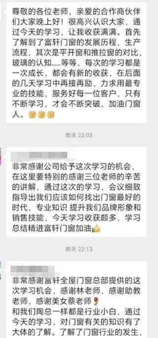 現場的學員們收獲匪淺,學習到豐富的門窗行業與產品知識,全方位的了解了門窗的工藝、結構、分類、專業術語、賣點等方面,充分認識到富軒全屋門窗的品牌優勢與產品技術優勢,可以在日后的談單過程當中學以致用,用極具差異化的產品優勢與服務,贏得消費者的信賴與支持。富軒全屋門窗五月新商特訓班仍在如火如荼的進行當中,讓我們繼續期待接下來的精彩內容~