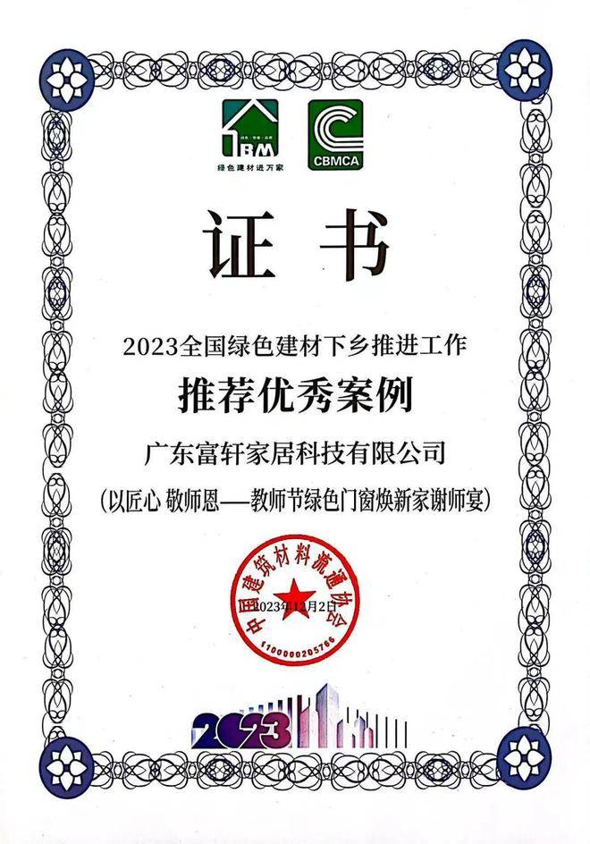 富軒全屋門窗獲評全國綠色建材下鄉推進工作推薦優秀案例
