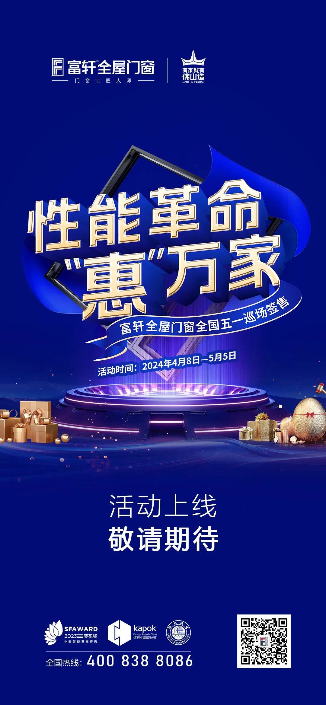 2024年4月1日,「性能革命“惠”萬家」富軒全屋門窗全國五一巡場簽售啟動儀式圓滿舉行。2024年4月8日至5月5日,富軒全屋門窗將聯動全國各地門店,攜多款高性能門窗產品鉅惠來襲,實力大促銷,品質不打折!