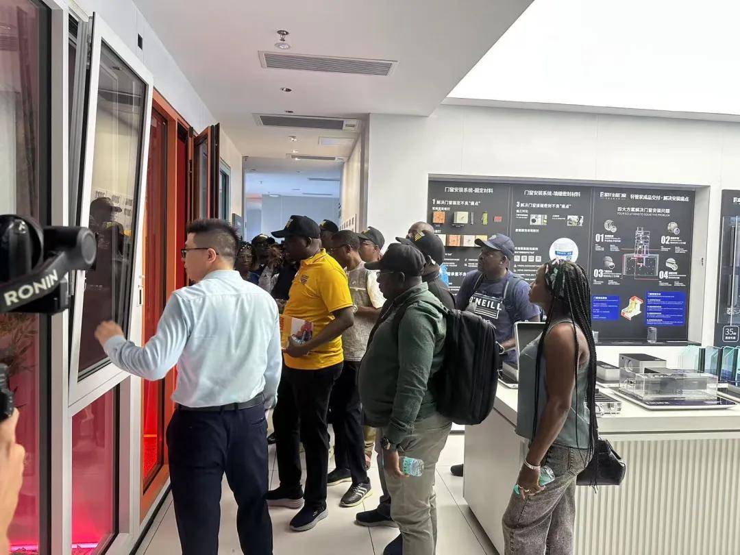 在富軒現代化展廳中,非洲考察團成員穿梭于一個個精心打造的場景空間,目睹一塊鋁合金型材如何經歷72道精密工序蛻變為兼具美學與功能的門窗藝術品。從航空級鋁材的抗變形性能,到三玻兩腔中空玻璃的極致隔音隔熱表現,再到隱藏式排水系統對極端天氣的從容應對,每一處細節都在詮釋“中國匠造”的精度與溫度。非洲考察團以專業眼光審視每一處細節,探尋富軒產品吸引國際目光、尤其是應對嚴苛非洲環境的奧秘。