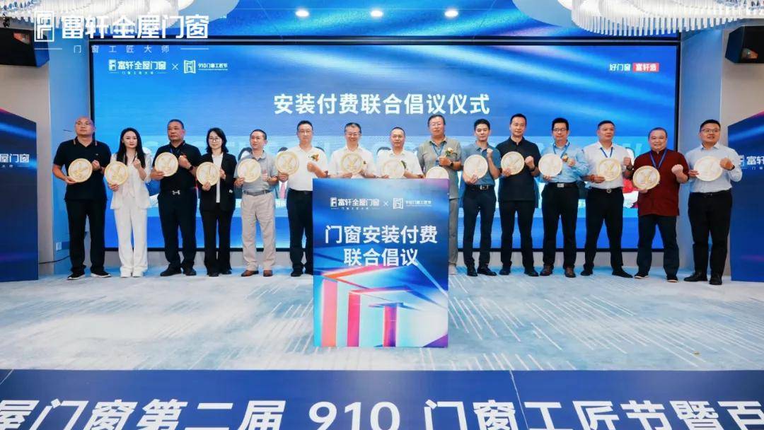 “安裝付費倡議儀式”將第二屆910門窗工匠節活動推向高潮。重視門窗安裝價值,推動安裝服務標準化,門窗安裝是影響產品使用體驗的關鍵環節,合理的安裝付費機制不僅能提升安裝流程的系統化、標準化,更能保障消費者的權益。中國建筑材料流通協會秦會長、富軒全屋門窗董事長李董、佛山市家居產業聯合會黨支部楊書記等15位嘉賓共同上臺,發起“門窗安裝付費聯合倡議”。