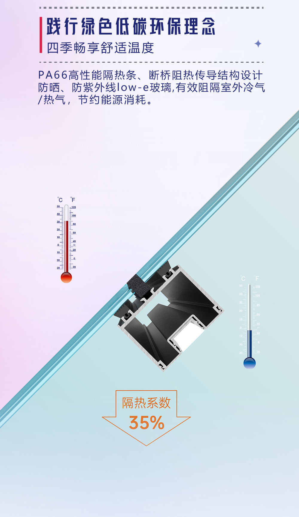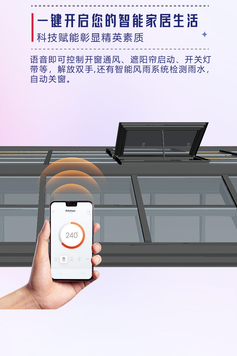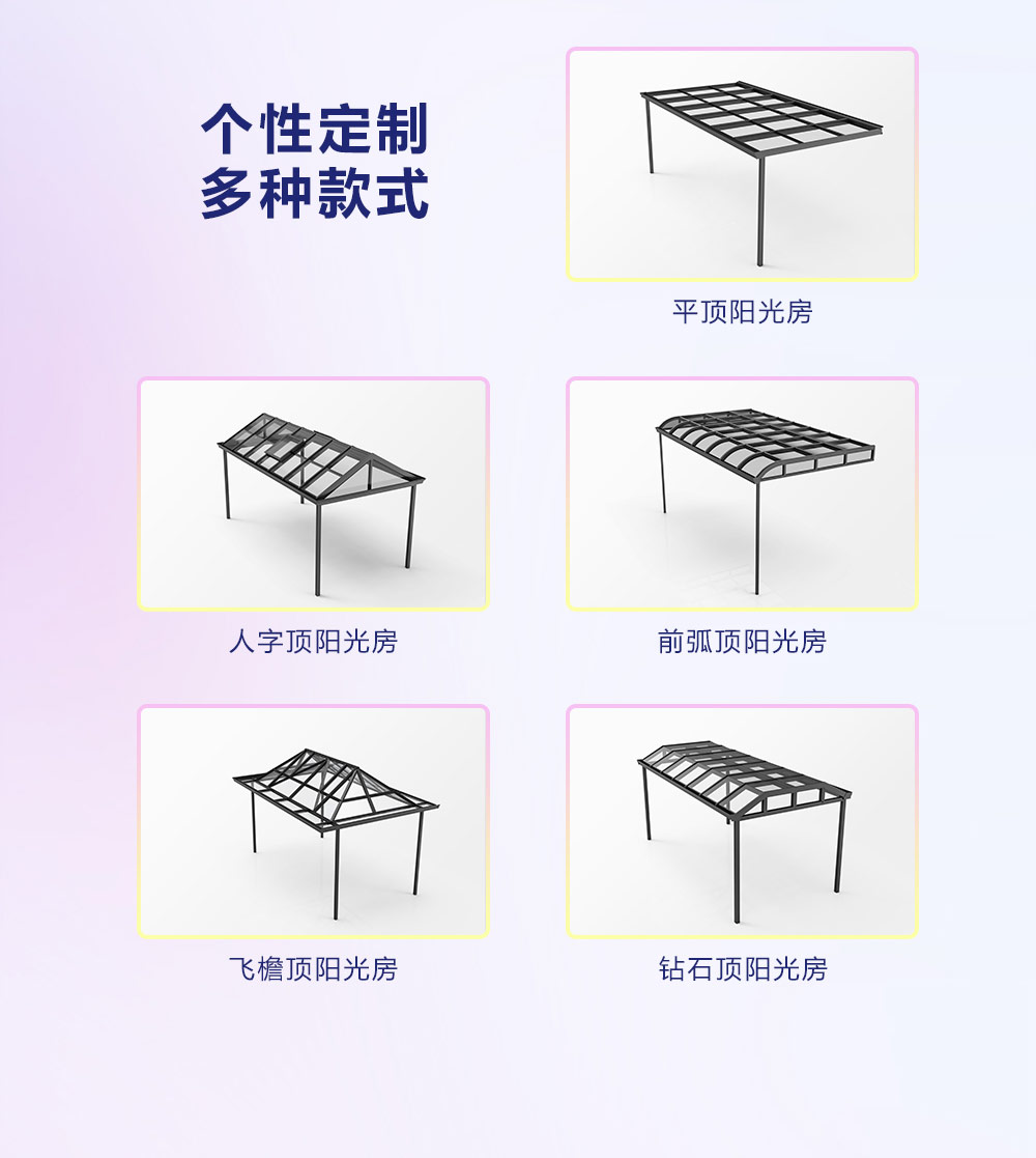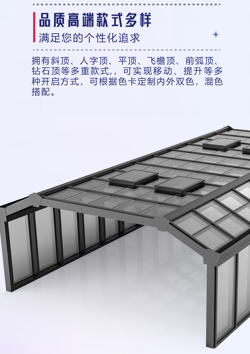 【產品系列】:陽光房 【產品型號】:135陽光房 【開啟方式】:配套平開式天窗 【產品風格】:現代簡約 【產品結構】:主梁:135*65*3 側梁:135*110*3 副梁:60*65*3 前梁:91*110*2.5 立柱:110*110*2.5 靠墻掛鉤:120*31*6.5 【產品性能】::水密性能6級、隔音性能≥35DB、氣密性能8級、抗風壓性能9級、保溫性能K≤2.5 【五金配置】: