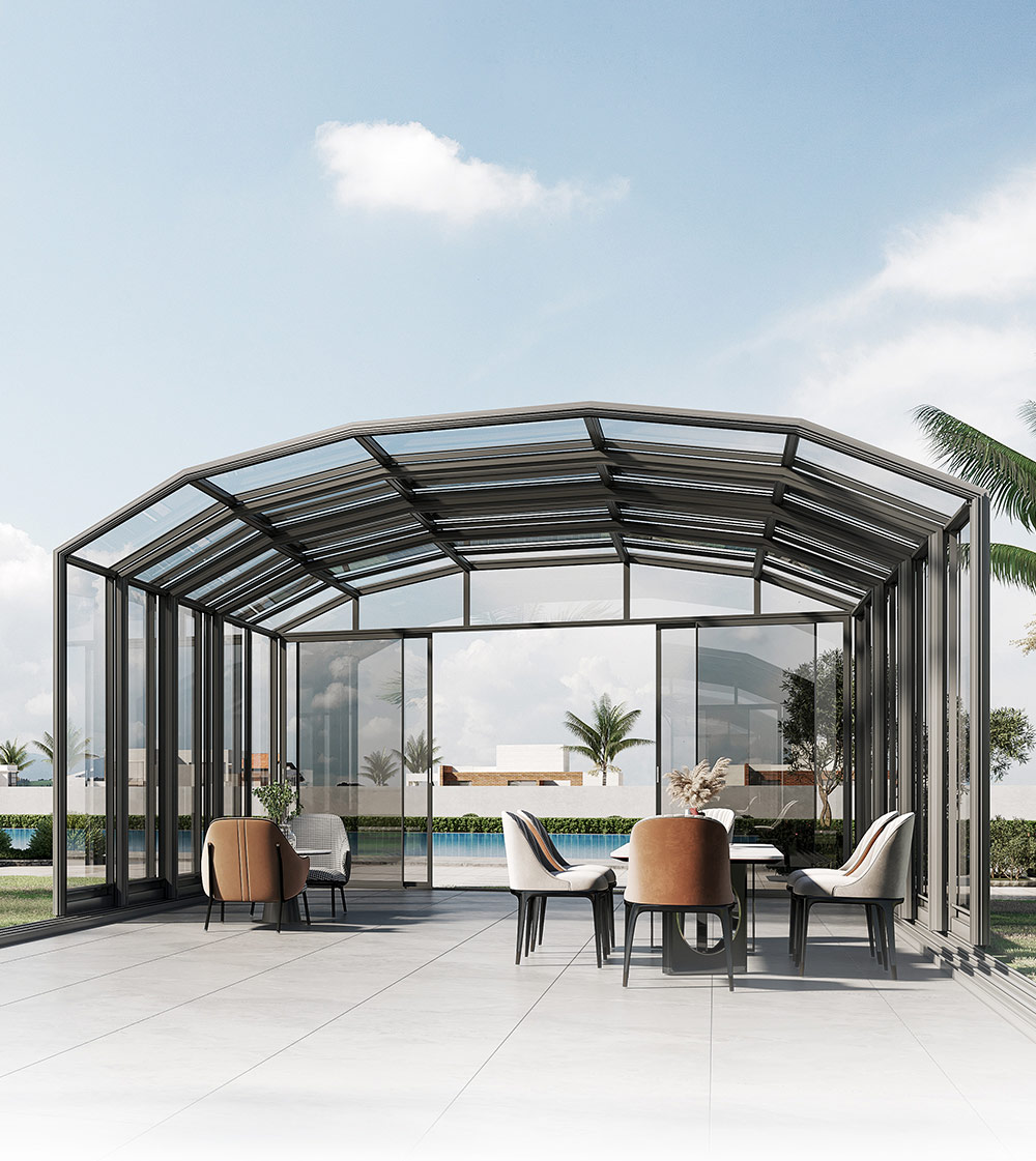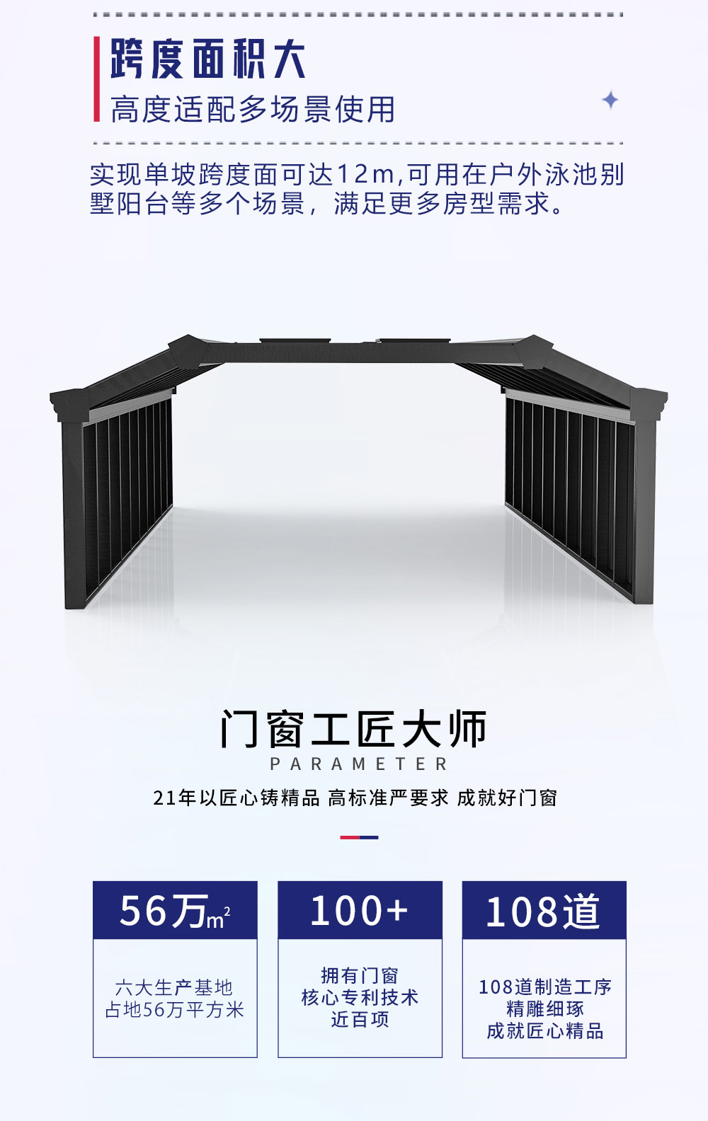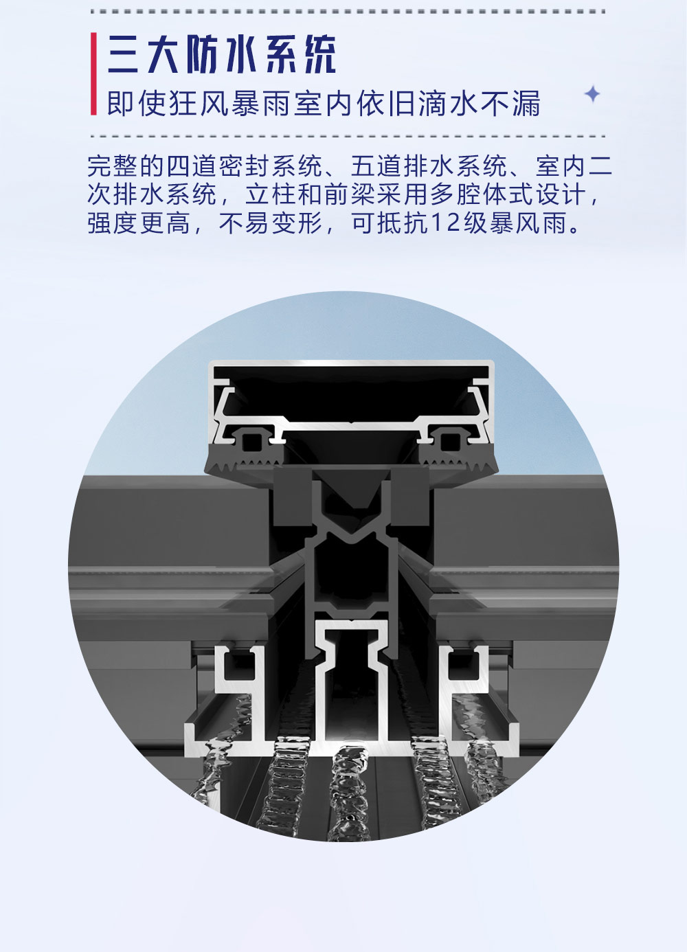 【產品系列】:陽光房 【產品型號】:135陽光房 【開啟方式】:配套平開式天窗 【產品風格】:現代簡約 【產品結構】:主梁:135*65*3 側梁:135*110*3 副梁:60*65*3 前梁:91*110*2.5 立柱:110*110*2.5 靠墻掛鉤:120*31*6.5 【產品性能】::水密性能6級、隔音性能≥35DB、氣密性能8級、抗風壓性能9級、保溫性能K≤2.5 【五金配置】: